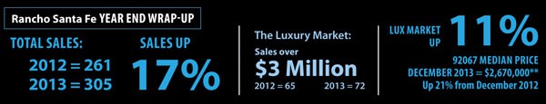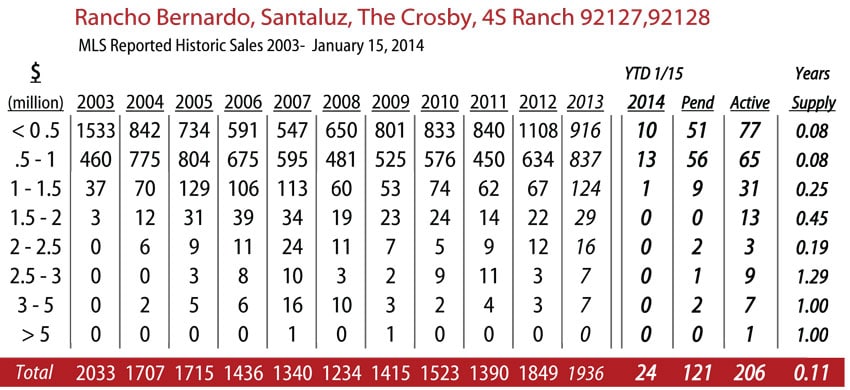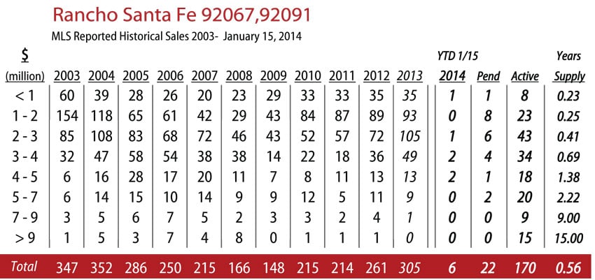 Click here for Rancho Santa Fe historical sales compared by price range 2003- 2013 < $1 million,  $1 – $3 million, $3 – $5 million, > $5 million