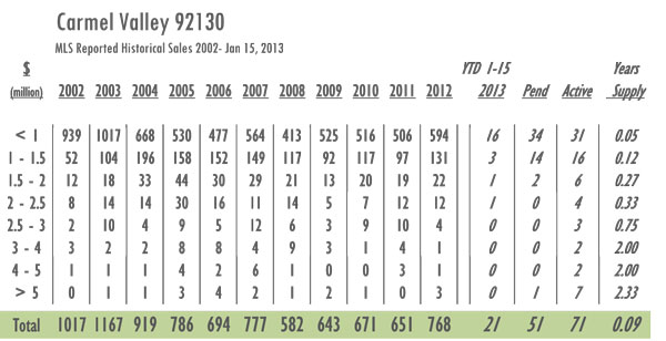 Carmel Valley Luxury Real Estate 2013 YTD sales as of 1/15/13= 21 with 71 active listings currently on the market. In 2012 sales as of 1/15 = 13 and there were 167 active listings on the market. Year-over-year Carmel Valley has gone from a 3-month supply of inventory to just a 1-month supply with inventory decreased by 57%. With 768 sales in 2012 Carmel Valley posted its highest numbers since 2007.