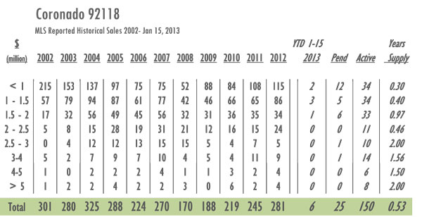 Coronado Luxury Real Estate 2013 YTD sales as of 1/15/13= 6 with 150 active listings currently on the market. In 2012 sales as of 1/15 = 7 and there were 156 active listings on the market. Year-over-year Coronado has gone from a 7.5-month supply of inventory to just over a 6-month supply with inventory decreased by 4%. With 245 sales in 2012 Coronado posted its highest numbers since 2007.