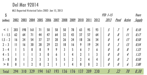 Del Mar Luxury Real Estate 2013 YTD sales as of 1/15/13 =5 with 70 active listings currently on the market. In 2012 sales as of 1/15 = 6 and there were 128 active listings on the market. Year-over-year Del Mar has gone from a 7-month supply of inventory to a 3.5-month supply with inventory decreased by 45%. With 230 sales in 2012 Del Mar posted its highest numbers since 2004.
