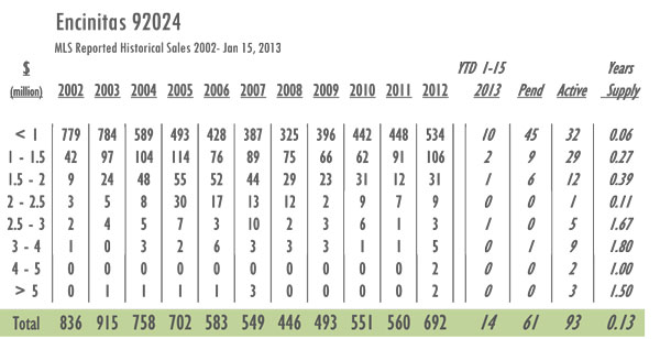 Encinitas Luxury Real Estate 2013 YTD sales as of 1/15/13= 14 with 93 active listings currently on the market. In 2012 sales as of 1/15 = 15 and there were 204 active listings on the market. Year-over-year Encinitas has gone from just a 4-month supply of inventory to a 1.5-month supply with inventory decreased by 54%. With 692 sales in 2012 Encinitas posted its highest numbers since 2005.