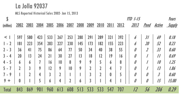 La Jolla Luxury Real Estate 2013 YTD sales as of 1/15/13 = 12 with 206 active listings currently on the market. In 2012 sales as of 1/15 = 12 and there were 309 active listings on the market. Year-over-year La Jolla has gone from just under a 7-month supply of inventory to a 3.5-month supply with inventory decreased by 33%. With 707 sales in 2012 La Jolla posted its highest numbers since 2005.