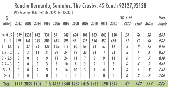 Rancho Bernardo, Santaluz, The Crosby, 4S Ranch Luxury Real Estate 2013 YTD sales as of 1/15/13= 42 with 117 active listings currently on the market. In 2012 sales as of 1/15 = 27 and there were 425 active listings on the market. Year-over-year Rancho Bernardo has have gone from just under a 4-month supply of inventory to just under a 1-month supply with inventory decreased by 72%. With 1849 sales in 2012 Rancho Bernardo posted its highest numbers since 2003.