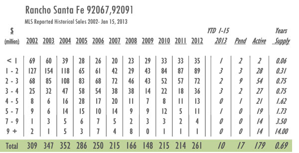 Rancho Santa Fe Luxury Real Estate 2013 YTD sales as of 1/15/13= 10 with 179 active listings currently on the market. In 2012 sales as of 1/15 = 4 and there were 215 active listings on the market. Year-over-year Rancho Santa Fe has gone from a 12-month supply of inventory to just over an 8-month supply with inventory decreased by 17%. With 261 sales in 2012 Rancho Santa Fe posted its highest numbers since 2005.