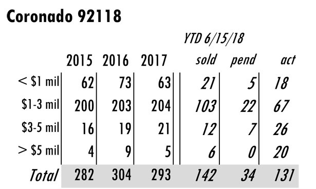 JULY Issue Coronado total MLS reported sales, active listings, month’s inventory supply, and median sales price** compared to the same period last year.
