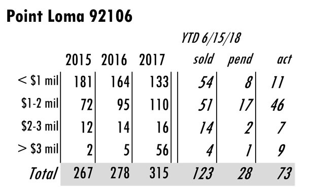 JULY Issue Point Loma San Diego total MLS reported sales, active listings, month’s inventory supply, and median sales price** compared to the same period last year.