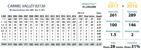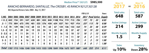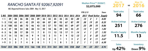 Based on MLS data from these zip codes, 92067,92091,92014,92037,92130,92118,92024,92127,92128, 92008,92009,92010,92011,9075,92064,92101 for the period of 1/1/2004 – 5/15/2017.