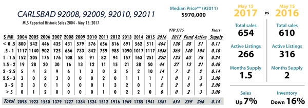 JUNE Issue Carlsbad total MLS reported sales, active listings, month’s inventory supply, and median sales price** compared to the same period last year.