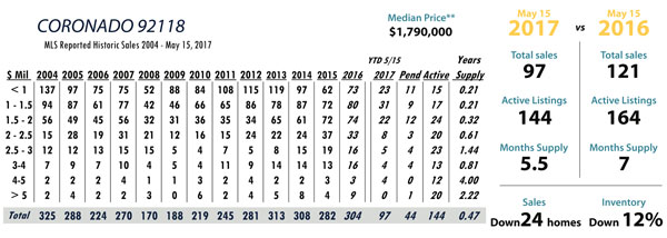 JUNE Issue Coronado total MLS reported sales, active listings, month’s inventory supply, and median sales price** compared to the same period last year.