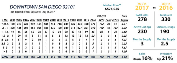 JUNE Issue Downtown San Diego total MLS reported sales, active listings, month’s inventory supply, and median sales price** compared to the same period last year.