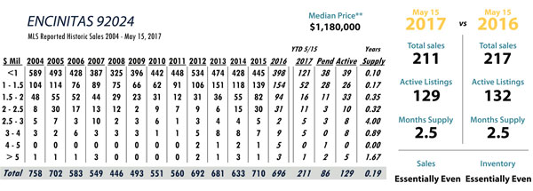 JUNE Issue Encinitas total MLS reported sales, active listings, month’s inventory supply, and median sales price** compared to the same period last year.