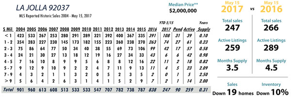 JUNE Issue La Jolla total MLS reported sales, active listings, month’s inventory supply, and median sales price** compared to the same period last year.