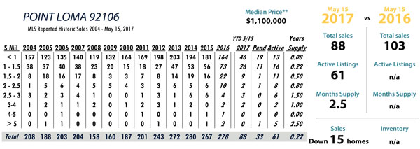 JUNE Issue Point Loma total MLS reported sales, active listings, month’s inventory supply, and median sales price** compared to the same period last year.