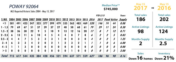 JUNE Issue Poway total MLS reported sales, active listings, month’s inventory supply, and median sales price** compared to the same period last year.