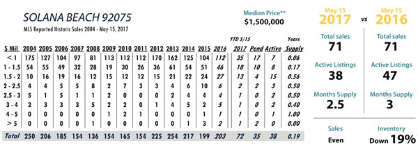 JUNE Issue Solana Beach total MLS reported sales, active listings, month’s inventory supply, and median sales price** compared to the same period last year.