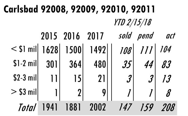 MARCH Issue Carlsbad total MLS reported sales, active listings, month’s inventory supply, and median sales price** compared to the same period last year.
