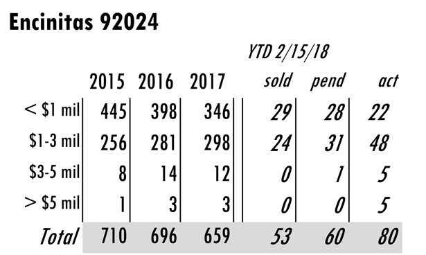 MARCH Issue Encinitas total MLS reported sales, active listings, month’s inventory supply, and median sales price** compared to the same period last year.