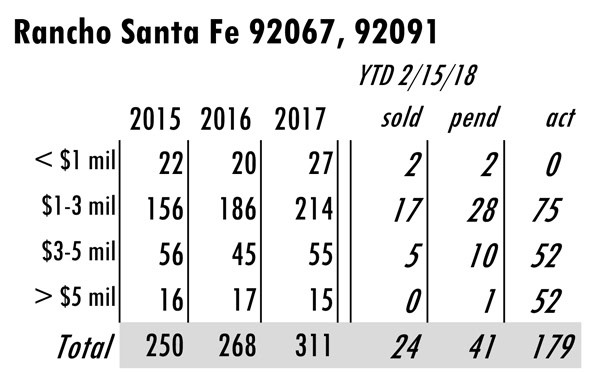 MARCH Issue Rancho Santa Fe total MLS reported sales, active listings, month’s inventory supply, and median sales price** compared to the same period last year.
