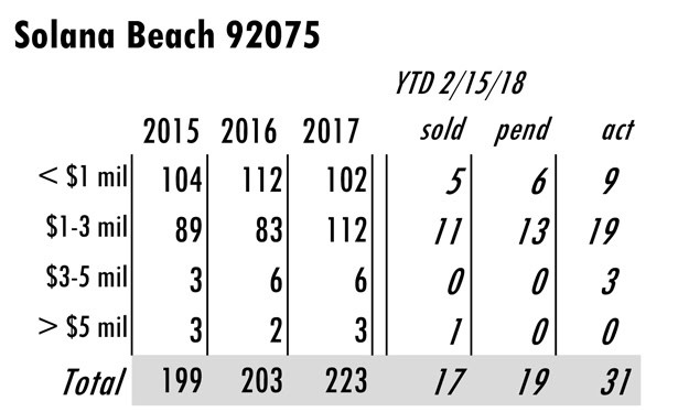 MARCH Issue Solana Beach total MLS reported sales, active listings, month’s inventory supply, and median sales price** compared to the same period last year.