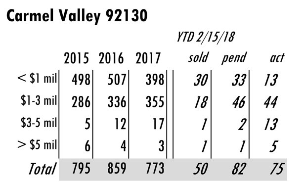 MARCH Issue Carmel Valley total MLS reported sales, active listings, month’s inventory supply, and median sales price** compared to the same period last year.