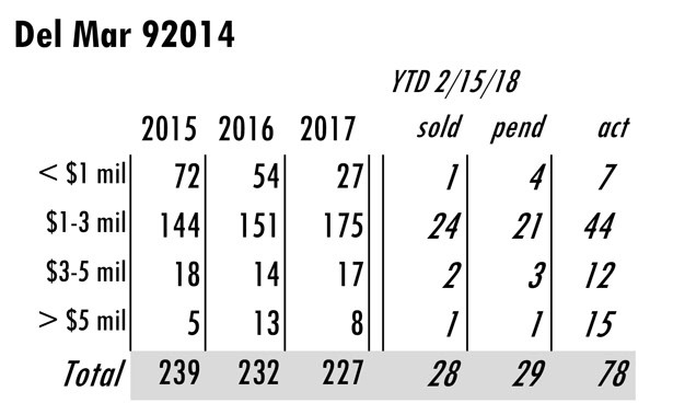 MARCH Issue Del Mar total MLS reported sales, active listings, month’s inventory supply, and median sales price** compared to the same period last year.