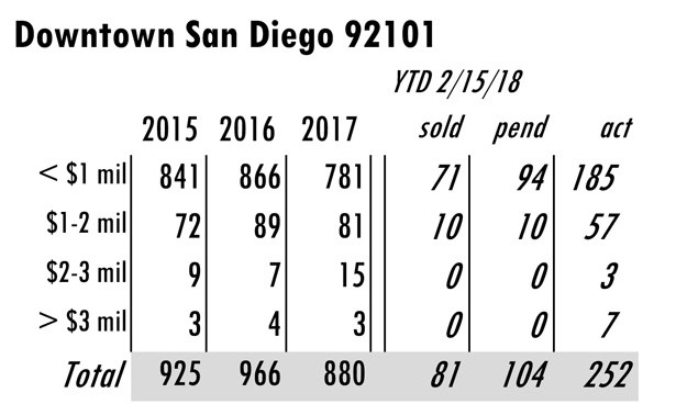 MARCH Issue Downtown San Diego total MLS reported sales, active listings, month’s inventory supply, and median sales price** compared to the same period last year.