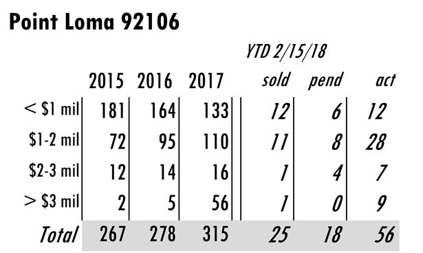 MARCH Issue Point Loma total MLS reported sales, active listings, month’s inventory supply, and median sales price** compared to the same period last year.