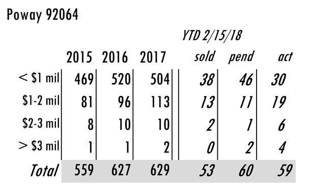 MARCH Issue Poway total MLS reported sales, active listings, month’s inventory supply, and median sales price** compared to the same period last year.