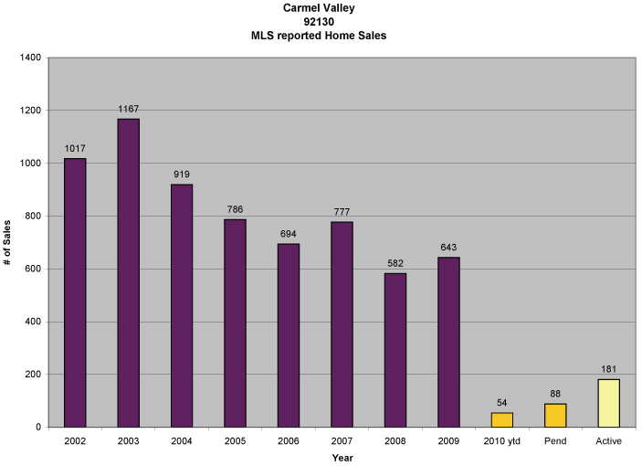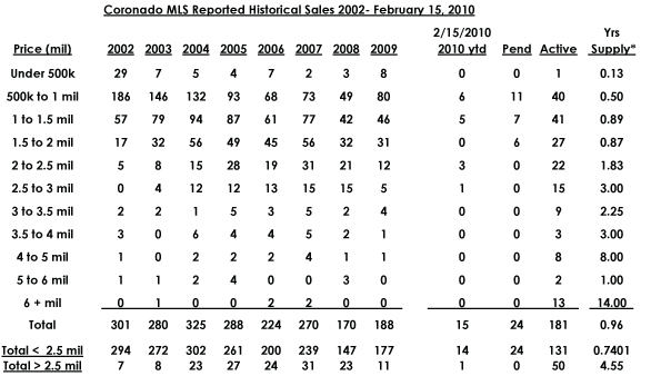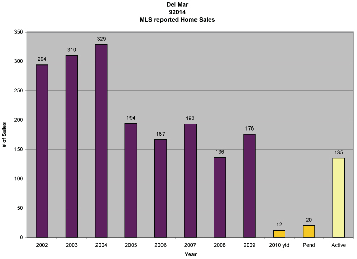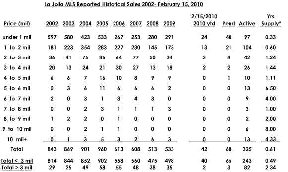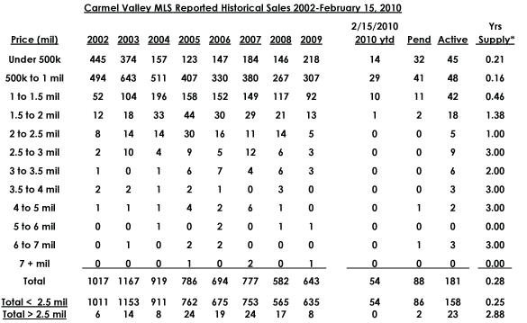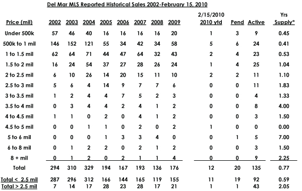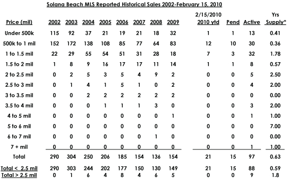 SALES ACTIVITY: Over the past month, the total number of closed sales in 2010 rose from 6 to 21, an increase of 15 closed sales. The number of homes in escrow as of February 15, 2010 decreased however, from 19 a month ago to 15. When factoring in the 15 properties which closed escrow this past month, 11 net new escrows opened since January 15, 2010.