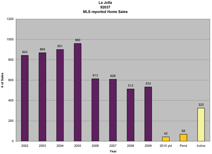 SALES ACTIVITY: Sales activity in La Jolla remains consistently active. There were 34 closed sales during the past month, raising the total number of closings year-to-date from 8 a month ago to 42. The number of homes in escrow increased to 68 from 56 a month ago. Subtracting the number of closed sales the previous month, there were 46 net new escrows opened.