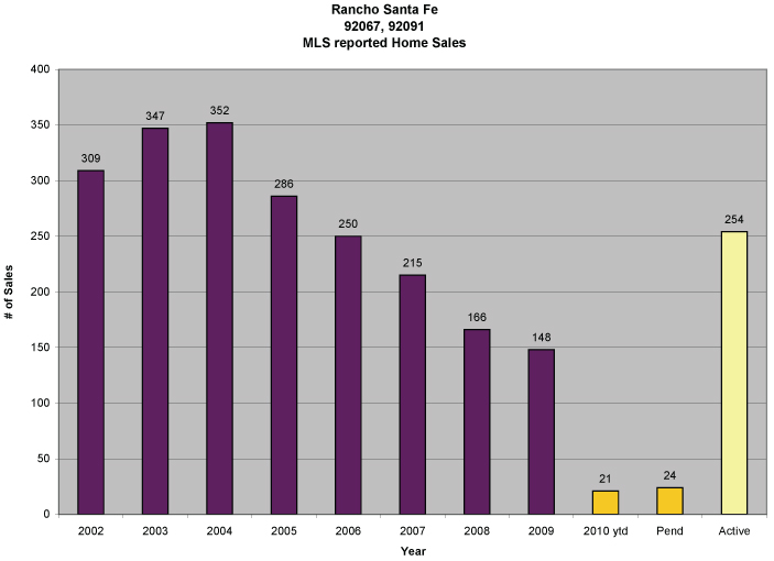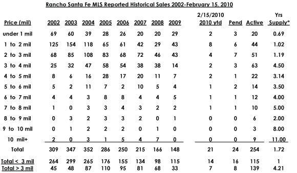INVENTORY LEVELS: The number of homes listed for sale has decreased over the past month to 254 compared to 273 on January 15, 2010. The current listing inventory has slid to just over a 20-month supply, while still the highest level of inventory when compared to other San Diego County luxury home communities, it continues its downward trend and is the lowest level since we started reporting in June of 2009.