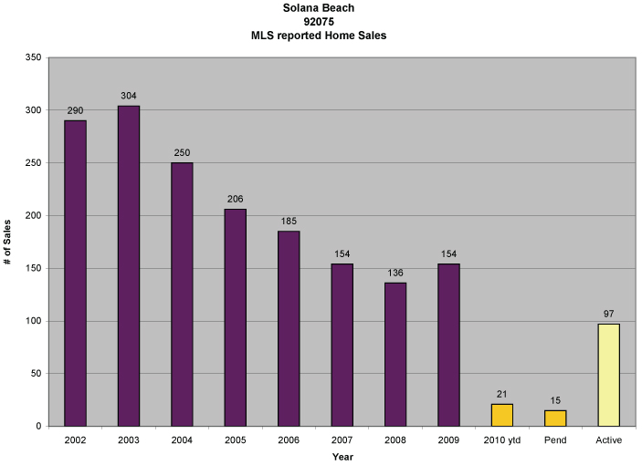 SALES ACTIVITY: Sales activity in Encinitas remains active. There were 31 closed sales during the past month, raising the total number of closings year-to-date from 21 to 52 through February 15, 2010. The number of homes in escrow increased by 12; increasing from 75 to 87. Subtracting the number of closed sales the previous month, there were 43 net new escrows opened.