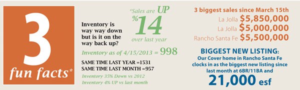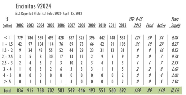 Encinitas Luxury Real Estate YTD sales as of 4/15/13= 169 with 110 active listings currently on the market. In 2012 sales as of 4/15 =143 and there were 187 active listings on the market. Year-over-year Encinitas has gone from a 4-month supply of inventory to just under a 2-month supply with inventory decreased by 41% and sales up 18%.