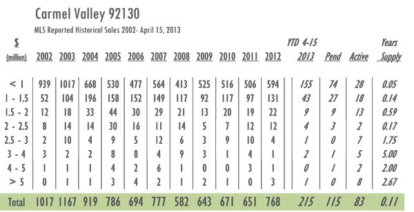 Carmel Valley Luxury Real Estate 2013 YTD sales as of 4/15/13= 215 with 83 active listings currently on the market. In 2012 sales as of 4/15 = 159 and there were 173 active listings on the market. Year-over-year Carmel Valley has gone from a 3-month supply of inventory to just over a 1-month supply with inventory decreased by 52% and sales up 35%.
