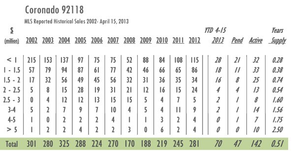 Coronado Luxury Real Estate 2013 YTD sales as of 4/15/13= 70 with 142 active listings currently on the market. In 2012 sales as of 4/15 = 63 and there were 190 active listings on the market. Year-over-year Coronado has gone from just over a 9-month supply of inventory to a 6-month supply with inventory decreased by 34% and sales up 11%.
