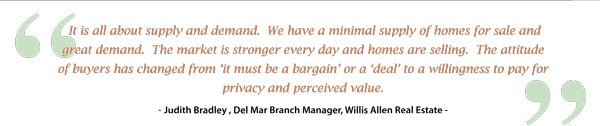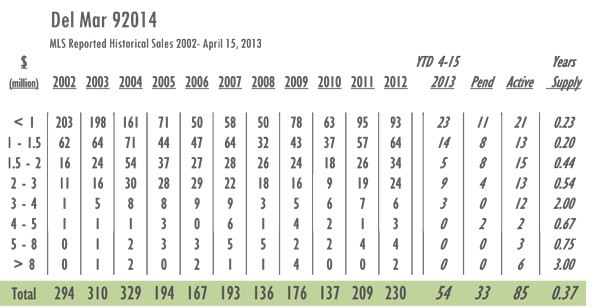 Del Mar Luxury Real Estate 2013 YTD sales as of 4/15/13 =54 with 85 active listings currently on the market. In 2012 sales as of 4/15 = 51 and there were 125 active listings on the market. Year-over-year Del Mar has gone from just over a 7-month supply of inventory to a 4.5-month supply with inventory decreased by 32% and sales up 6%.