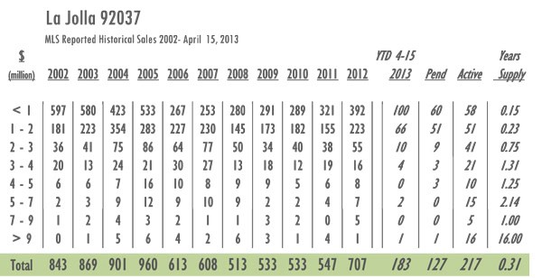 La Jolla Luxury Real Estate 2013 YTD sales as of 4/15/13 = 183 with 217 active listings currently on the market. In 2012 sales as of 4/15 = 150 and there were 332 active listings on the market. Year-over-year La Jolla has gone from a 7-month supply of inventory to just under a 4-month supply with inventory decreased by 35% and sales up 22%.