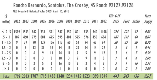 Rancho Bernardo, Santaluz, The Crosby, 4S Ranch Luxury Real Estate 2013 YTD sales as of 4/15/13= 443 with 130 active listings currently on the market. In 2012 sales as of 4/15 = 437 and there were 302 active listings on the market. Year-over-year Rancho Bernardo has have gone from just a 2.5-month supply of inventory to less than a 1-month supply with inventory decreased by 57% and sales essentially even.