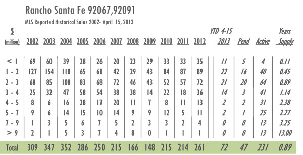 Rancho Santa Fe Luxury Real Estate 2013 YTD sales as of 4/15/13= 72 with 231 active listings currently on the market. In 2012 sales as of 4/15 = 58 and there were 222 active listings on the market. Year-over-year Rancho Santa Fe has gone from a 12.5-month supply of inventory to a 10.5-month supply with inventory now up 4% and sales also up 25%.