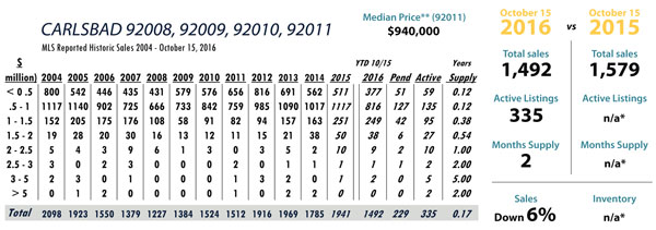 NOVEMBER Issue Carlsbad total MLS reported sales, active listings, month’s inventory supply, and median sales price** compared to the same period last year.