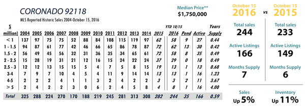 NOVEMBER Issue Coronado total MLS reported sales, active listings, month’s inventory supply, and median sales price** compared to the same period last year.