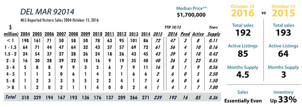 NOVEMBER Issue Del Mar total MLS reported sales, active listings, month’s inventory supply, and median sales price** compared to the same period last year.