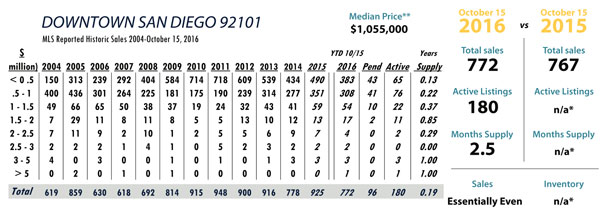 NOVEMBER Issue Downtown San Diego total MLS reported sales, active listings, month’s inventory supply, and median sales price** compared to the same period last year.