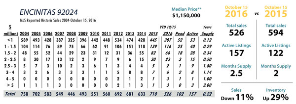 NOVEMBERIssue Encinitas total MLS reported sales, active listings, month’s inventory supply, and median sales price** compared to the same period last year.