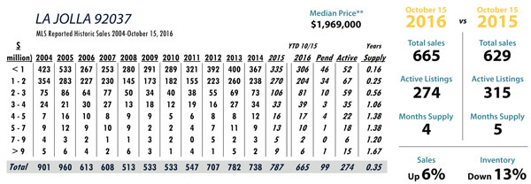 NOVEMBER Issue La Jolla total MLS reported sales, active listings, month’s inventory supply, and median sales price** compared to the same period last year.