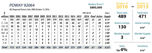 NOVEMBER Issue Poway total MLS reported sales, active listings, month’s inventory supply, and median sales price** compared to the same period last year.