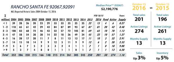 NOVEMBER Issue Rancho Santa Fe total MLS reported sales, active listings, month’s inventory supply, and median sales price** compared to the same period last year.