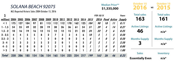 NOVEMBER Issue Solana Beach total MLS reported sales, active listings, month’s inventory supply, and median sales price** compared to the same period last year.