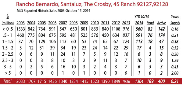 Click here for Rancho Santa Fe historical sales compared by price range 2003- 2013 < $1 million, $1 – $3 million, $3 – $5 million, > $5 million