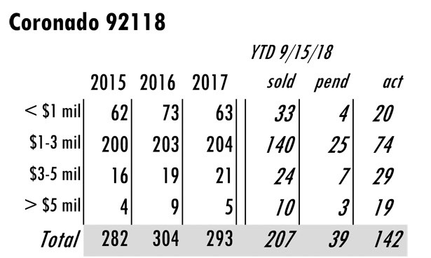 OCTOBER Issue Coronado total MLS reported sales, active listings, month’s inventory supply, and median sales price** compared to the same period last year.